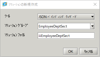 6. [ソリューション ファイル] には、このソリューションに対するファイル名 (iiiEmployeeDeptSect) を入力します。この名前は、プロジェクト(prj)ファイルに使用されます。また、ソリューション用に生成されるオブジェクトの一部の接頭辞として JSON ウィザードでも使用されます。