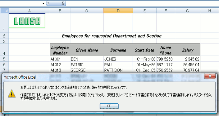 2. ファンクション iiiFN13 をコンパイルして再度テストします。Excelドキュメントを変更しようとすると、 以下のメッセージが表示されます。