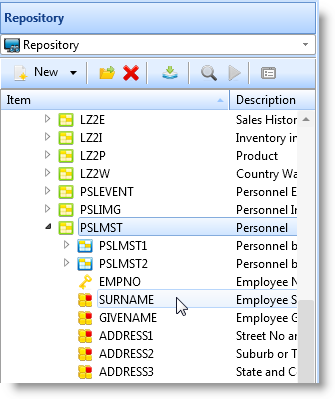 リポジトリタブでPSLMSTファイルを再度表示します。 以下のフィールドをフォームにドラッグ・アンド・ドロップします。