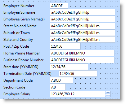 フォームをフィールドにドラッグすると、フィールド定義で指定されたラベルも表示されることに注目してください。また、フィールドで必要な長さを示すサンプル・データが挿入されています。 |