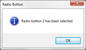 use builtin(MESSAGE_BOX_SHOW) with_args(OK OK Information 'Radio Button' 'Radio button 2 has been selected')