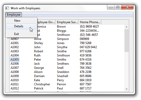 ここで使用するサンプル・アプリケーションには、2つのウィンドウ(フォーム)があります。最初のウィンドウには、社員のリストが社員番号と自宅の電話番号とともに表示されます。