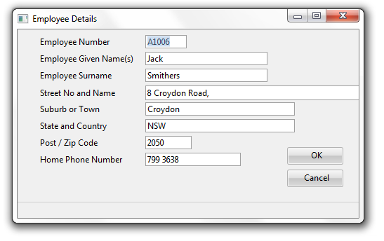 アプリケーションでは、別の社員の詳細ウィンドウに社員の詳細を表示します。このウィンドウは、ユーザーが社員を選択し、社員メニューの詳細オプションを選択すると表示されます。