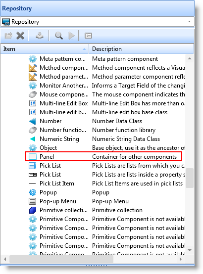 デフォルトでは、再利用可能パーツは、#PRIM_PANELを継承します。これは、基本のVisual LANSAパネルです。ボタン(#PRIM_PHBN)やLANSAフィールドなどの任意のタイプのコンポーネント(フォームを除く)を再利用可能パーツの祖先にすることができます。再利用可能パーツにロジックのみが含まれる場合は(かつビジュアル・インターフェースを含まない)祖先を#PRIM_OBJにするとメモリ効率が最もよくなります。