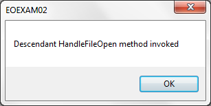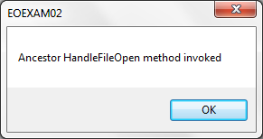 この動作を見るために、メッセージ・テキストを「Descendant HandleFileOpen method invoked」に変更し、祖先のフォームのHandleFileOpenメソッドをオーバーライドする継承フォーム#EOEXAM02にメソッド・ルーチンを追加します。