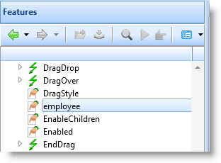 OKPressedイベントは、詳細タブのイベントタブで見ることができます。Employeeプロパティは、[機能]タブで見ることができます。