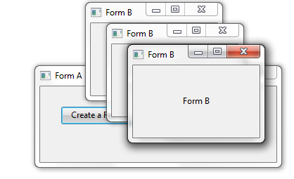 Form B 作成ボタンをクリックすると、Form Bの新しいインスタンスが作成され、コレクションに追加されます。その他の2つのボタンを使用してフォームを右または左に移動できます。