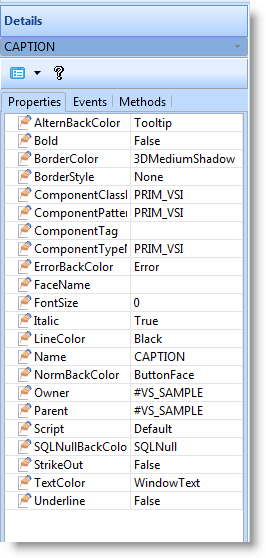 Captionスタイル・アイテムは、ラベルなどのコントロールが表示される方法を定義します。VS_Normスタイルでは、スタイル・アイテムは背景色をシステム色のButtonFace(大部分のワークステーションでは灰色)、フォントはMS Sans Serif 8ポイント、テキスト色はWindowsテキスト色(通常は黒)に設定します。境界線のスタイルは、左側に影がついて3D効果を作成する3D Leftに設定されます。