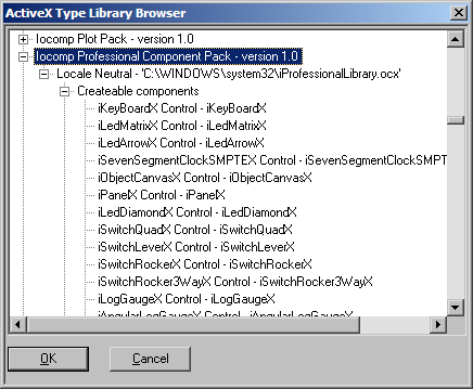 これを見るとわかるように、先の例で挙げたキーボード制御コントロールは、「Iocomp Professional Component Pack」というタイプ・ライブラリに属しています。展開表示してみると、ほかにも作成できるコンポーネントがあることがわかります。