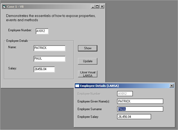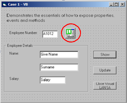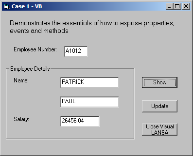 この例では、ActiveXの機能により、LANSAフォームのプロパティ、イベント、メソッドを他のアプリケーションに対して公開する、基本的な手順を説明します。