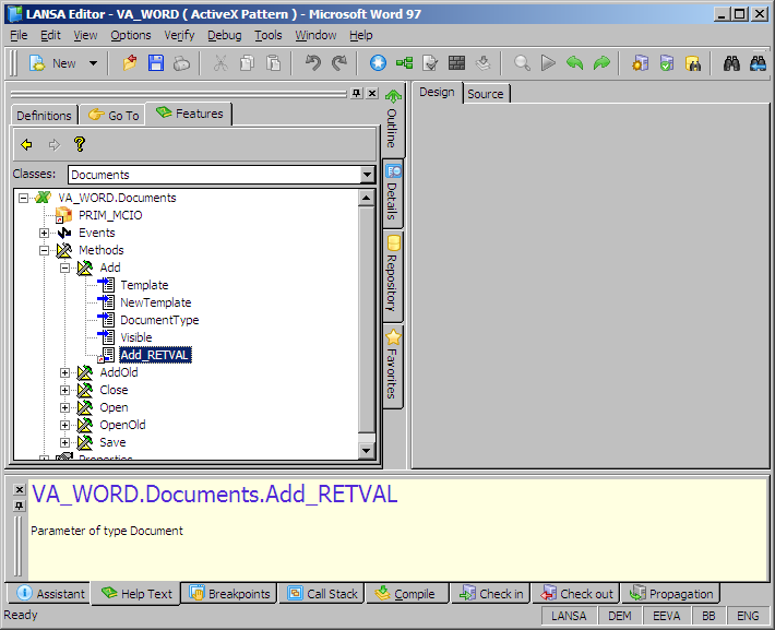 ここでは、New DocumentボタンのClickイベントに応じて、Addメソッドが起動されるようにしてみましょう。新規文書の作成には、LANSAデモ・システムに付属の、vl_sam99.dotというテンプレートを使います。また、文書名として、コンポーネント名#Worddocをそのまま与えます。