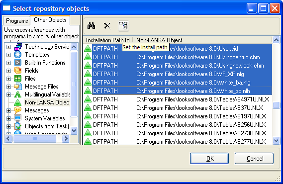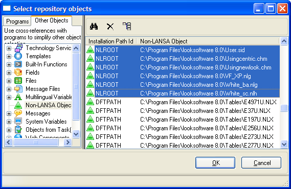 newlook オブジェクトの追加 | 全てのファイルを、newlook のルートディレクトリ (通常は C:\Program Files\looksoftware 8.0) から、パッケージの 非 LANSA オブジェクトのリストに追加してください。 newlook の Table ディレクトリ (C:\Program Files\looksoftware 8.0\Tables) の全てのファイルも追加してください。 newlook の他のサブディレクトリのオブジェクトは組み込まないでください。 | 配布ツールバーの [リポジトリオブジェクトの選択]] ボタンをクリックしてください。 次に、他オプション・タブの非 LANSA オブジェクトをダブルクリックしてください。looksoftware 8.0 のディレクトリを見つけて、ディレクトリの全てのオブジェクトを選択してください。 looksoftware 8.0/Tables ディレクトリの全てのファイルにも上記のステップ繰り返してください。 RAMP-NL アプリケーションに関連して looksoftware 8.0 ディレクトリに他のファイルを追加している場合は、同様に追加してください。 例えば、ユーザがプリントエミュレーションセッションを使用する場合は、全ての .nlp ファイルを Printers ディレクトリから追加してください。 | |