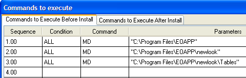 パッケージに newlook のディレクトリを作成するよう指示 | 配布パッケージに上記で指定した newlook ディレクトリを作成するように指示します。 そのためには、インストールを始める前に MD コマンド (Make Directory) を実行します。 | 配布ツールのツールバーの [実行するコマンド] ボタンをクリックします。 [導入する前に実行するコマンド] タブに、次のコマンドを入力してください。 以下の通りに、必ず二重引用符も入れてください。 ALL MD "C:\Program Files\Application Name" 配布ツールは、中間ディレクトリが存在している場合のみディレクトリを作成するので、中間ディレクトリを最初に作成しなければならないことに注意してください。 newlook ディレクトリに他のディレクトリを追加する場合は、それらのディレクトリを作成するために同様にコマンドを追加する必要があります。 | |