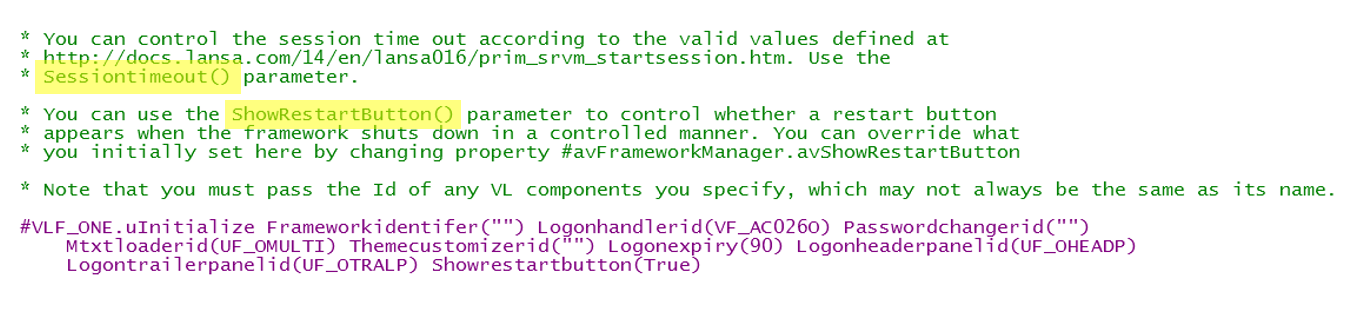 ShowRestartButton() パラメータを使用して、フレームワークを制御下でシャットダウンするときに開始ボタンを表示するかどうかを制御します。#avFrameworkManager.avShowRestartButton プロパティを変更することで、初期値を上書きすることができます。