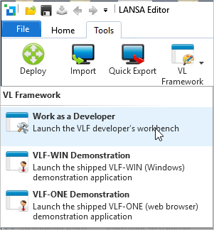 ワークベンチを開始するには、Visual LANSA エディターの [ツール] リボンから VL フレームワーク > 開発者のメニュー・オプションを選択してください。 ( VLF-WIN のデザイナー・メニュー・オプションを削除 )