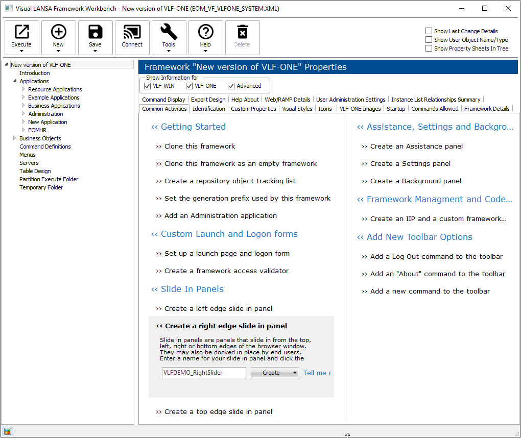 例えば、次のような拡張共通アクティビティにより、VLF-ONE の右端のスライダー・パネルが、たった 1 度のクリックで、生成、コンパイル、スナップインされます。