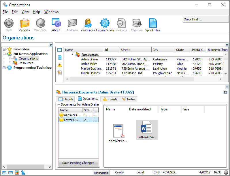 社員のドキュメントは、保存するとデータベースに格納されます。任意のタイプのPCファイル (pdf、htm、gifなど) を格納できます。