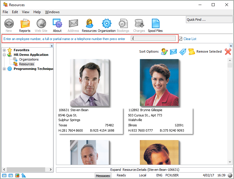 リソース ビジネス・オブジェクトでは、ユーザーがさまざまな方法で社員を検索できるミニ・フィルターを使用しています。