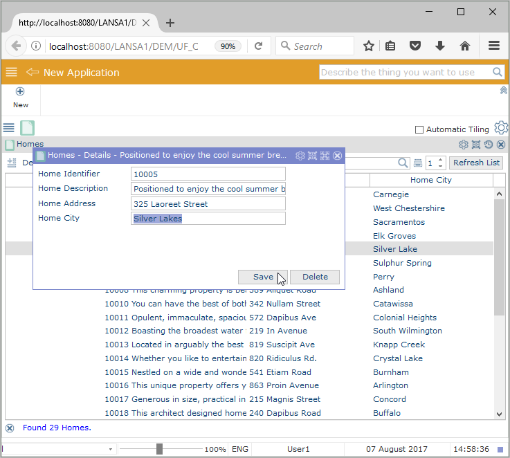 ビジネス・オブジェクトのインスタンスリストは、(xHomesForSale テーブルから) 売出し中の物件を表示します。
