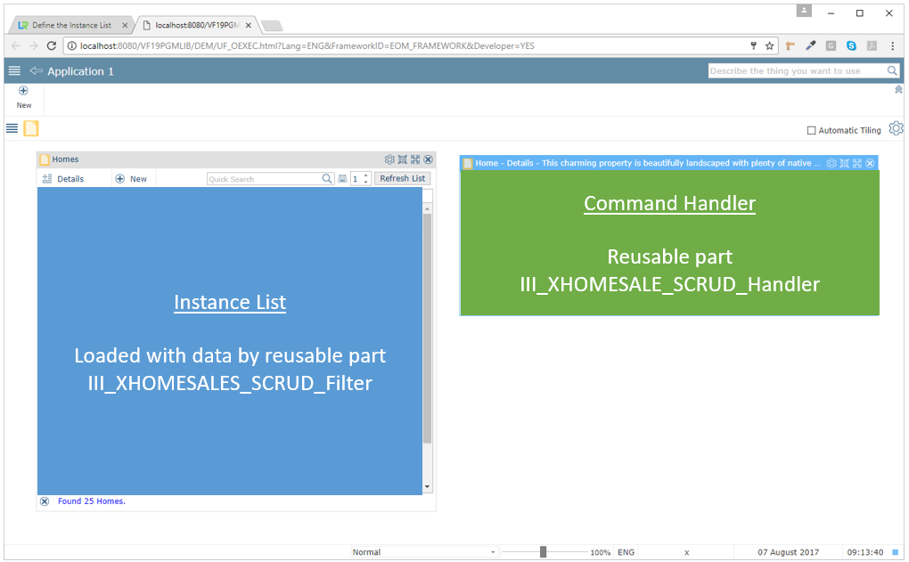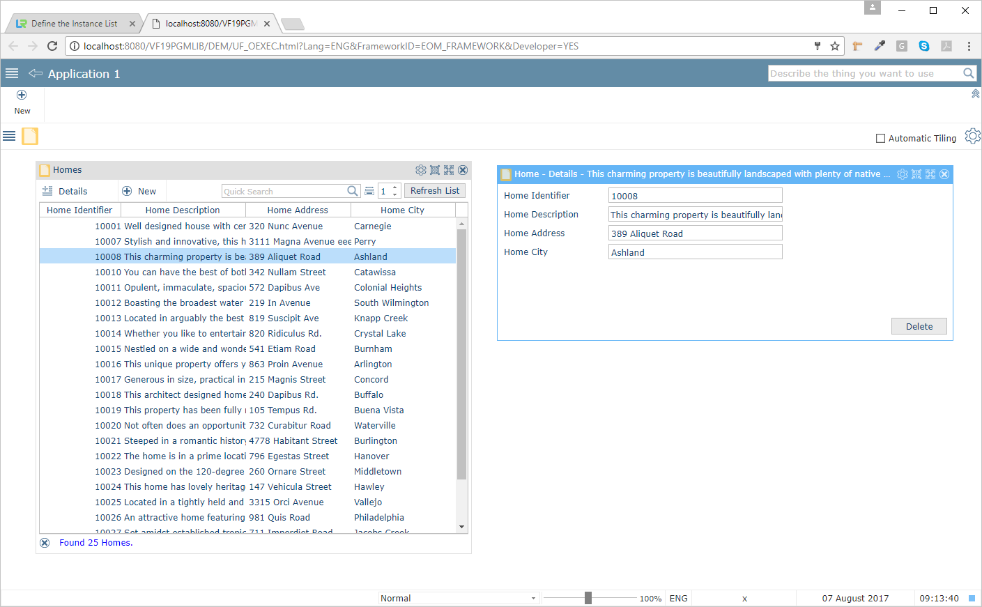 Homes ビジネス・オブジェクトの実行時にインスタンスリストから 1 つの物件を選択し、次のように表示されるようにします。