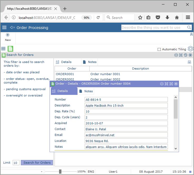 受注処理アプリケーションを選択し、次に受注ビジネス・オブジェクトを選択してください。[受注検索] をクリックして、インスタンスリストのエントリーに対する詳細コマンド・ハンドラーを表示します。