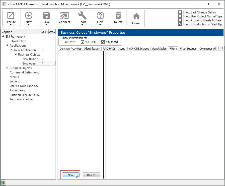 ワークベンチでビジネス・オブジェクト "社員" を選択し、[フィルター] タブを表示します。[新規作成] をクリックして、フィルターを指定します。
