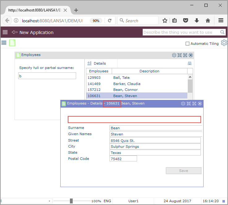 省略値では、コマンド・ハンドラーのすべてのフィールドは利用できるようになっており、更新可能です。しかし、社員レコードを識別するフィールド xEmployIdentification は更新されないようにしなければいけません。このフィールドを書き込み禁止にすることも可能ですが、この ID 番号はコマンド・ハンドラーのウィンドウのタイトルに表示されるため、これをパネル上で非表示にします。