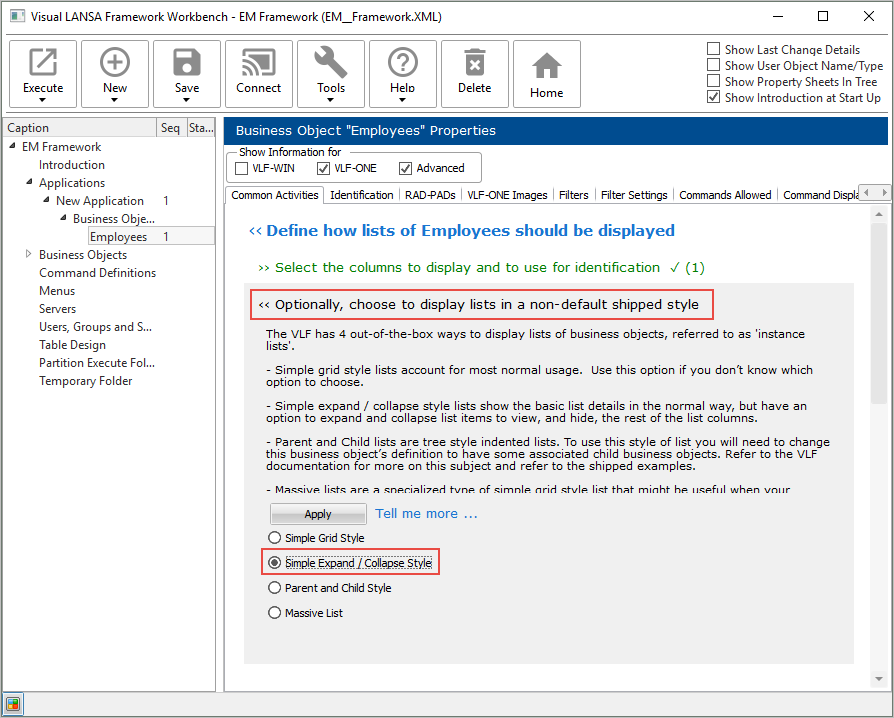 ワークベンチで [リストの出荷時スタイル表示を選択] を使って、[簡素な展開/折りたたみスタイル] を選択します。
