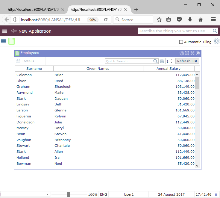 ここでフレームワークを実行し、"社員" ビジネス・オブジェクトを表示します。