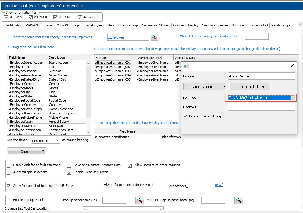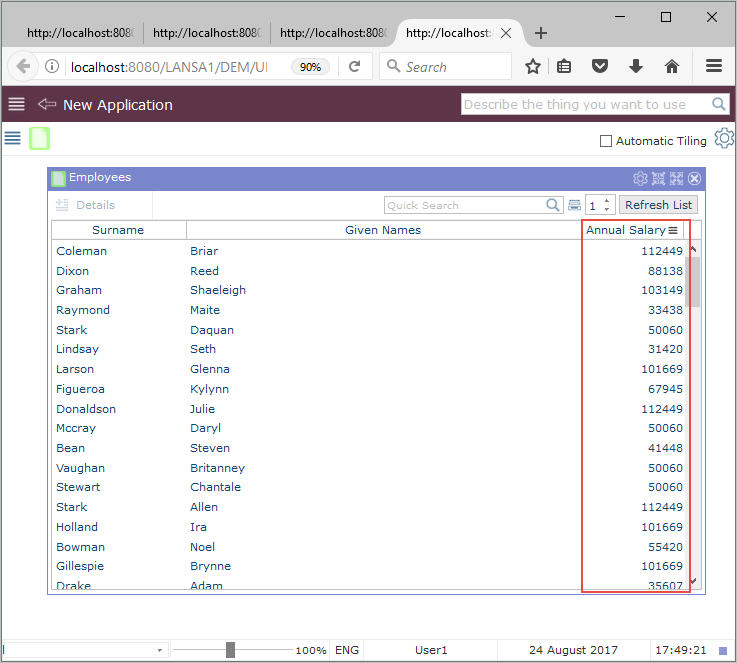 ワークベンチでインスタントリストの列の設定を変更できます。これがどのように行われているかを確認するには、"社員" の [インスタントリスト] タブを表示して、給与の列をクリックします。