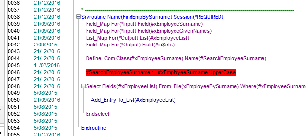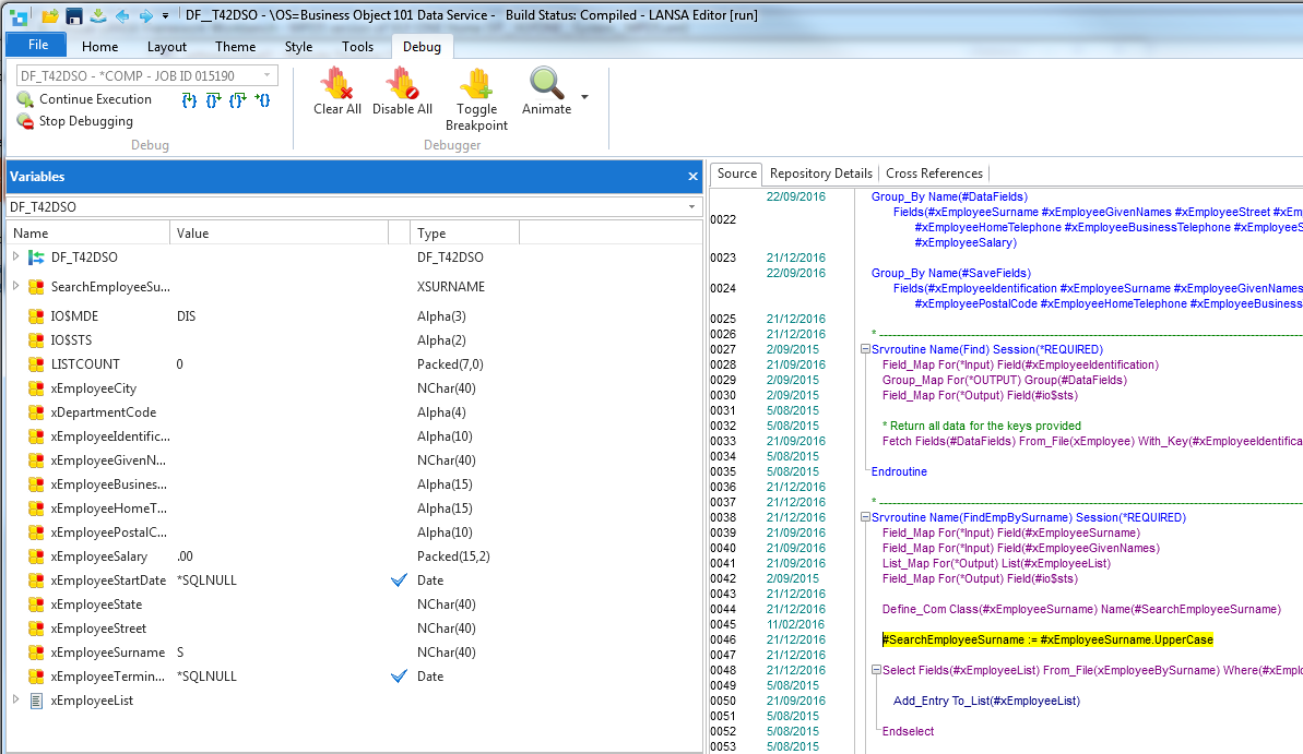 自身のブラウザで、ビジネス・オブジェクト (この例ではビジネス・オブジェクト 101) のデバッグを続け、検索を行います。Visual LANSA エディターによってブレークポイント、そしてすべてのフィールドやコンポーネントの値が示されます。