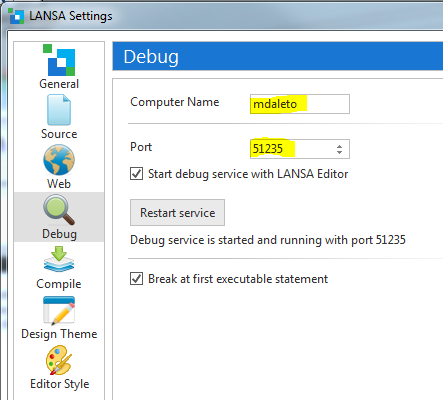 コンピュータ名とデバッグのポートを取得します。[ファイル] --> [オプション] --> [デバッグ]