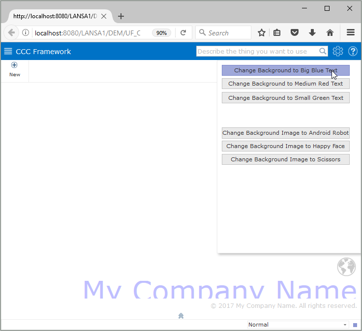 設定パネルを使って、ユーザーはアプリケーションの構成設定を変更できます。この演習では、設定パネル、イメージ、会社名および著作権の通知付きの背景パネルを作成し、さらに設定パネルからの要求を管理して、背景パネルのイメージやテキストのスタイルを変更するカスタマイズされたフレームワーク・マネージャを作成します。設定パネルの作成背景パネルの作成カスタム・フレームワーク・マネージャの作成設定パネルの編集背景パネルの編集設定パネルのテスト