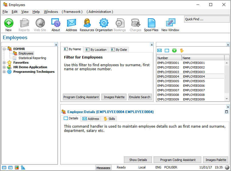 - "社員" ビジネス・オブジェクトには、名前、配属、日付という 3 つの フィルター と、社員の "詳細"、"住所"、"スキル" を処理するコマンド・ハンドラーが組み込まれています。さらに、エンドユーザーが新たに社員を定義するための新規作成コマンドもあります。
