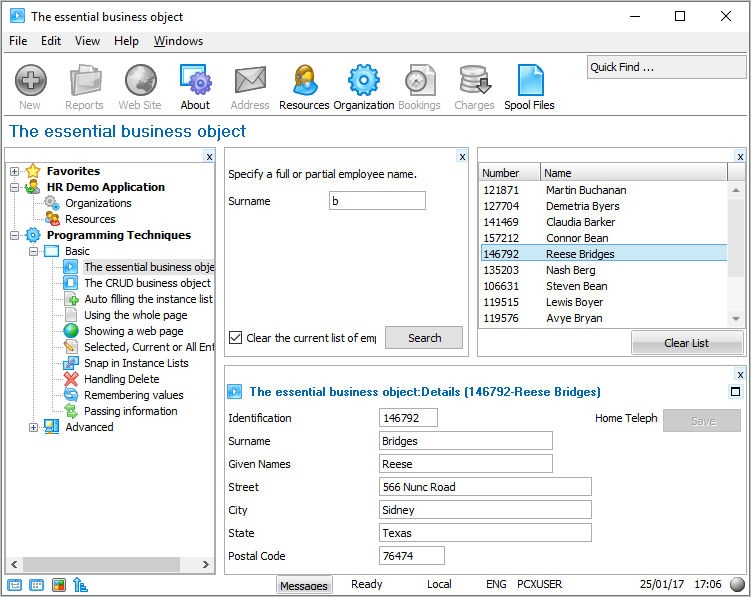このステップでは、ある社員を選択し、その社員に対して実行できる コマンド や処理を確認します。インスタンスリストで 1 人の社員を選択します。社員を選択すると、その社員の明細が下のパネルに表示されます。省略値で、詳細コマンドが実行されました。この詳細コマンド・ハンドラーは社員に関する詳細を表示します。