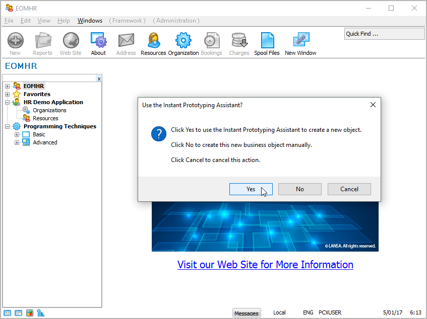 インスタント・プロトタイピング・アシスタントを使用すると、すべてのアプリケーション、そのアプリケーション内のビジネス・オブジェクト、および各ビジネス・オブジェクトで使用されるコマンドを含むアプリケーション構造全体を定義することができます。 常にすべて手動で追加することができますが、プロトタイプの作成を開始する場合は、この方法を使用する方がはるかにすばやく結果を得ることができます。 - [はい] ボタンをクリックします。[インスタント プロトタイピング アシスタント] ウィンドウが表示されます。