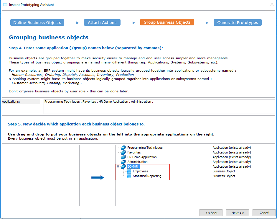 - これらのビジネス・オブジェクトを iiiHR アプリケーションにドラッグします。