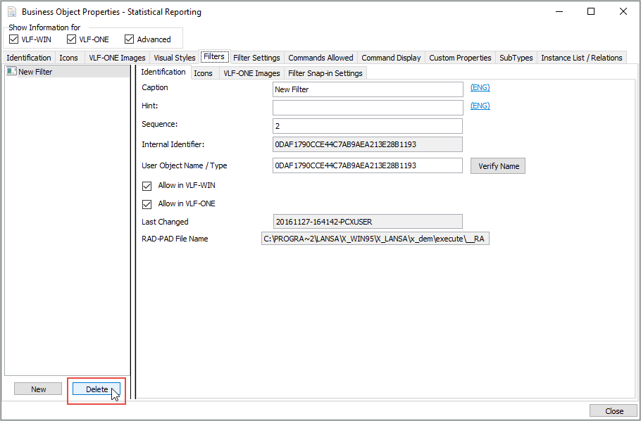 "統計レポート" ビジネス・オブジェクトにフィルターは必要ありません。「VLF004 - コマンドのプロトタイプ作成」でこのビジネス・オブジェクトを実装する方法を説明します。フィルターやインスタンスリストは、エンドユーザー・オブジェクトの操作に適したものであることが多いのですが、必須というわけではありません。例えば、付属のデモンストレーション・アプリケーションでは、ビジネス・オブジェクト「組織」はフィルターを使用しません。