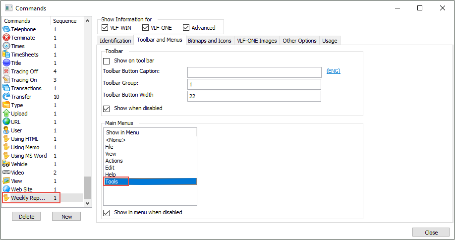 - [週報] コマンドを選択し、[メニュー表示] リストから [ツール] を選択して、このコマンドを [ツール] メニューに追加します。