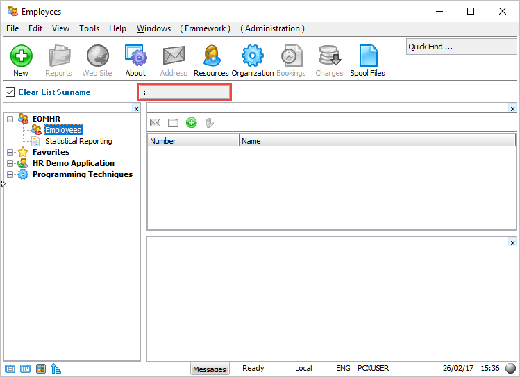 - フレームワークを終了してから再起動し、"社員" ビジネス・オブジェクトを選択します。ミニ・フィルターには、前回のフレームワークの実行時に入力された文字Sが含まれています。