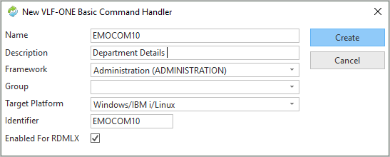 - パネル・タイプの再利用パーツを作成します。コマンド・ハンドラー名として iiiCOM10、説明に部門の詳細と指定します(ここで iii は入力者のイニシャルです。Visual LANSA の非ライセンス版または試行版を使っている場合は、iii の部分を DEM とする必要があります)。ターゲット・プラットフォームを Windows/IBM i/Linux にします。