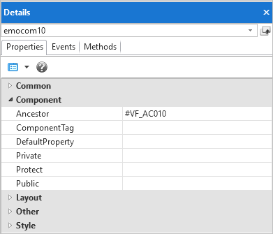 - コンポーネントの [詳細] タブをクリックし、[Ancestor] は VF_AC010 にします。