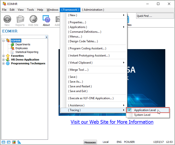 - [フレームワーク] メニューで、[トレース] オプション、[アプリケーション レベル] の順に選択します。
