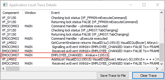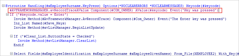 #AVFRAMEWORKMANAGER.avRecordTraceAValue Component(#COM_OWNER) AValue(#keycode) Event('Key was pressed') - #Com_Owner.avEvent を処理するイベント・ルーチンを探し、次のステートメントを追加し、EMPLOYEE_CHANGED イベントの起動がトレースされ、そのイベントから渡される社員番号が表示されるようにします。