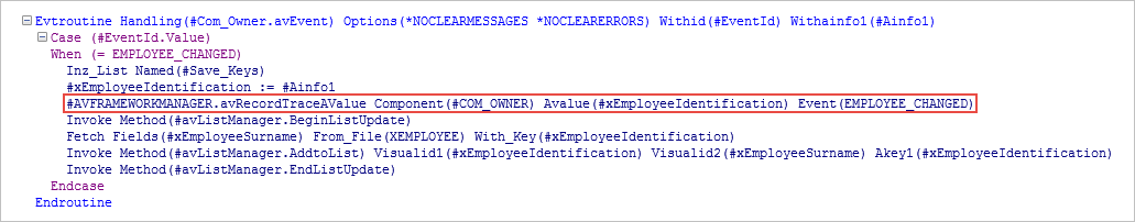 #AVFRAMEWORKMANAGER.avRecordTraceAValue Component(#COM_OWNER) AValue(#xEmployeeIdentification) Event(EMPLOYEE_CHANGED)