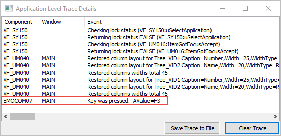 - フォーカスをミニ・フィルターに移動し、F3 を押します。トレース・ウィンドウに、キーが押されたことが表示されます。