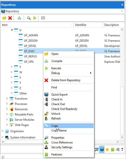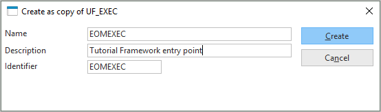 フレームワークがエンドユーザーにより実行される際、フォーム UF_EXEC が実行されます。フレームワーク用に、このエントリ・ポイント・フォームのコピーを作成する必要があります。UF* や DF* で始まるオブジェクトは、次回のアップデートや再インストールで上書きされる可能性があるので、実稼働のフレームワークでは参照するべきではないからです。