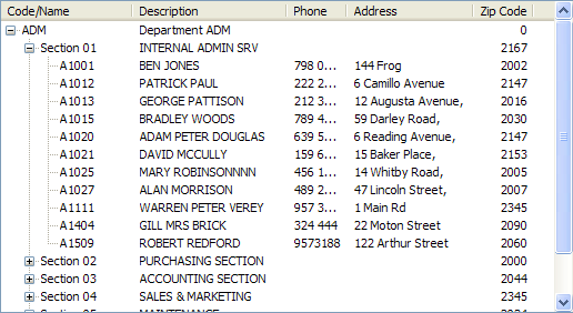 このスナップイン・インスタンスリスト・ブラウザの例は、組み込みのSECTIONS-EMPLOYEESインスタンスリストを3レベルのツリーとして表示します。