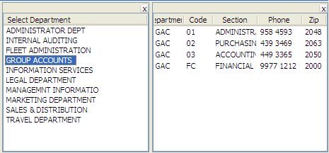 インスタント・フィルターは、例えば、すべての有効な部門のリストを提供できます。部門をクリックすると、課ビジネス・オブジェクトのインスタンスリストが瞬時にクリアされ、選択した部門の課で埋められます。