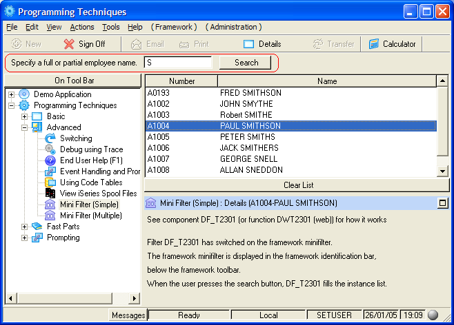 ミニ・フィルターは非表示フィルターに非常によく似ています。その違いは、ミニ・フィルターではフレームワークの確認バー上に常に表示されているフィールドと検索ボタンで、ユーザーが検索値を入力する必要がいまだにあることです(フィールドと検索ボタンはミニ・フィルター時のみ表示されます)。